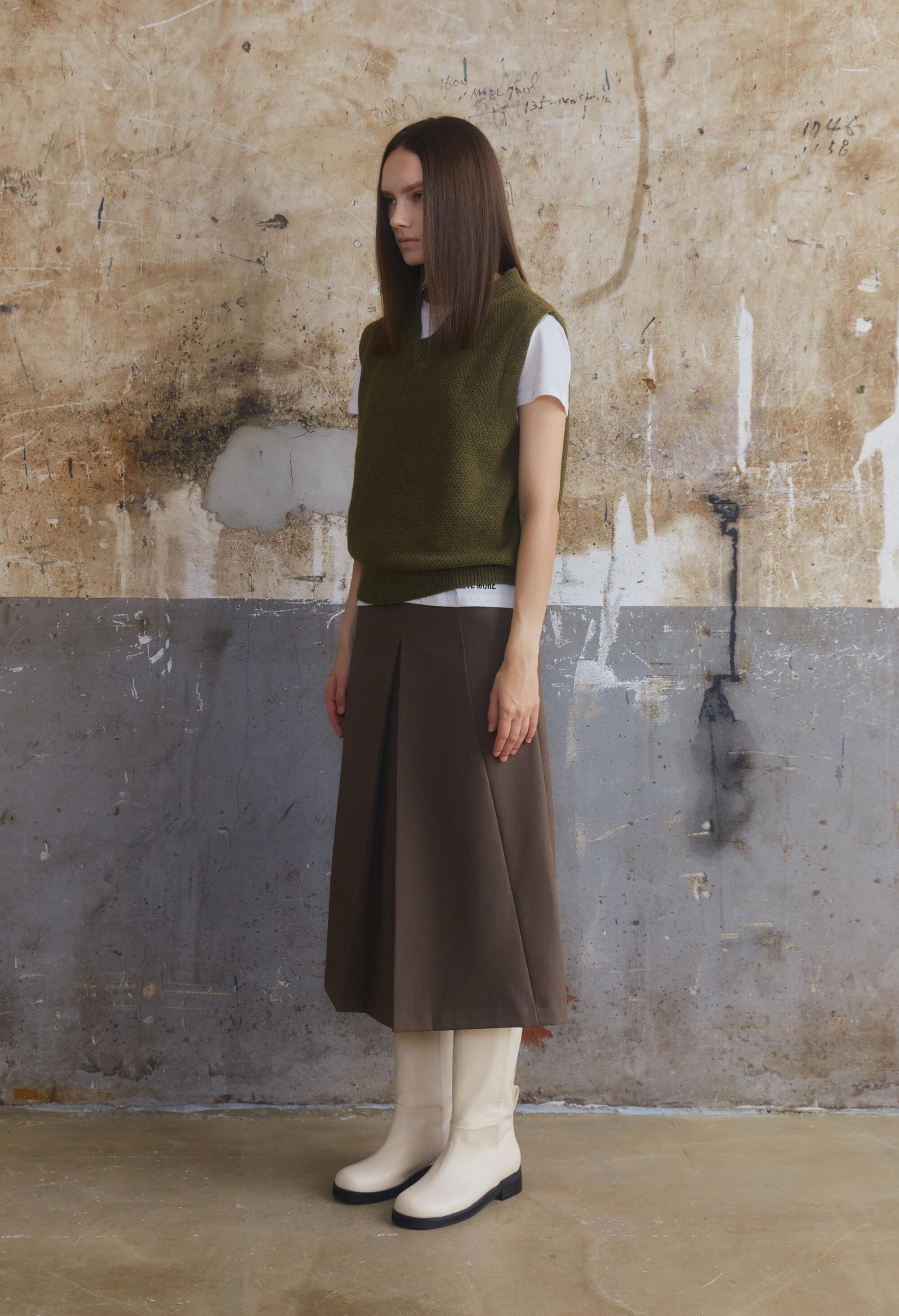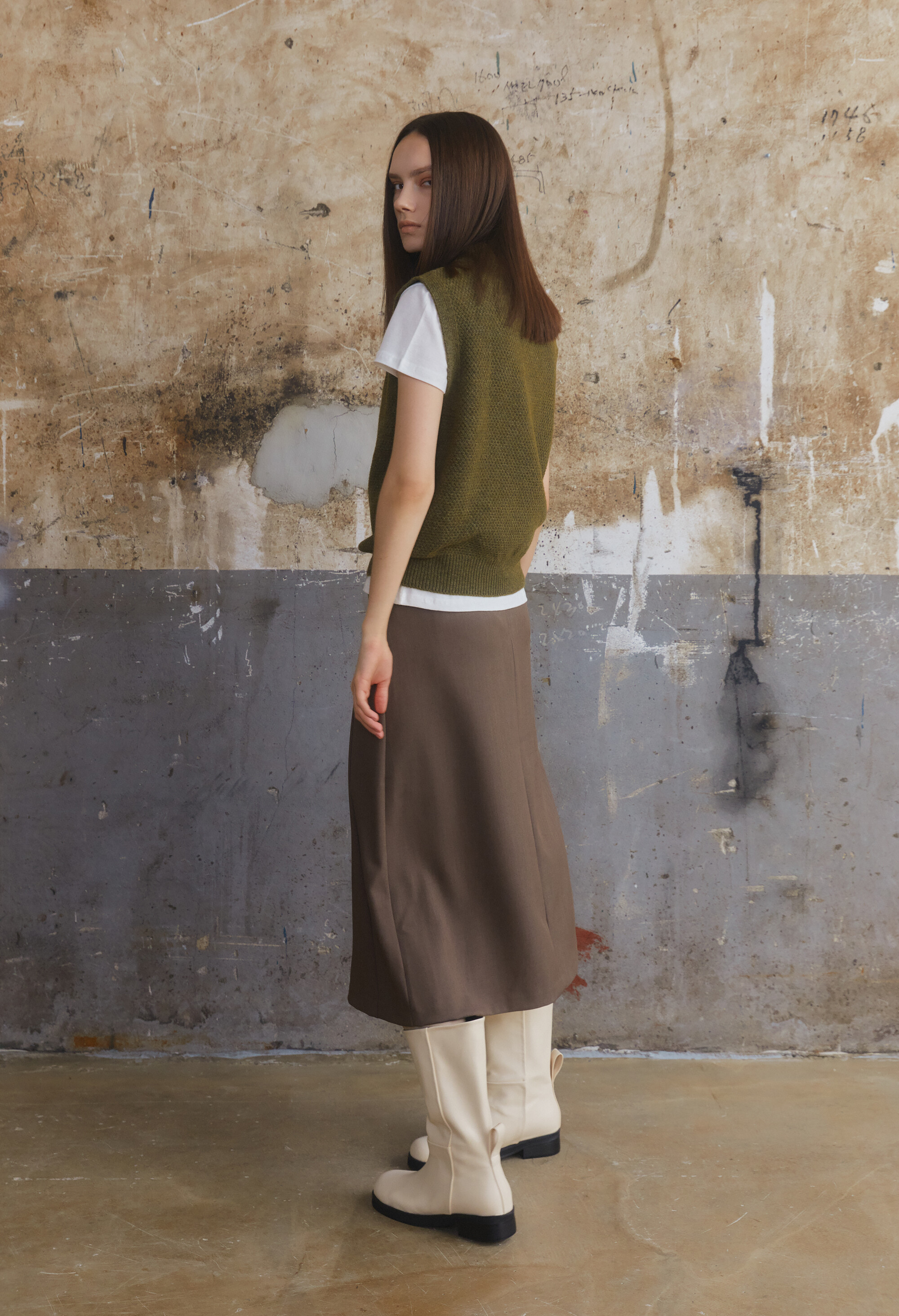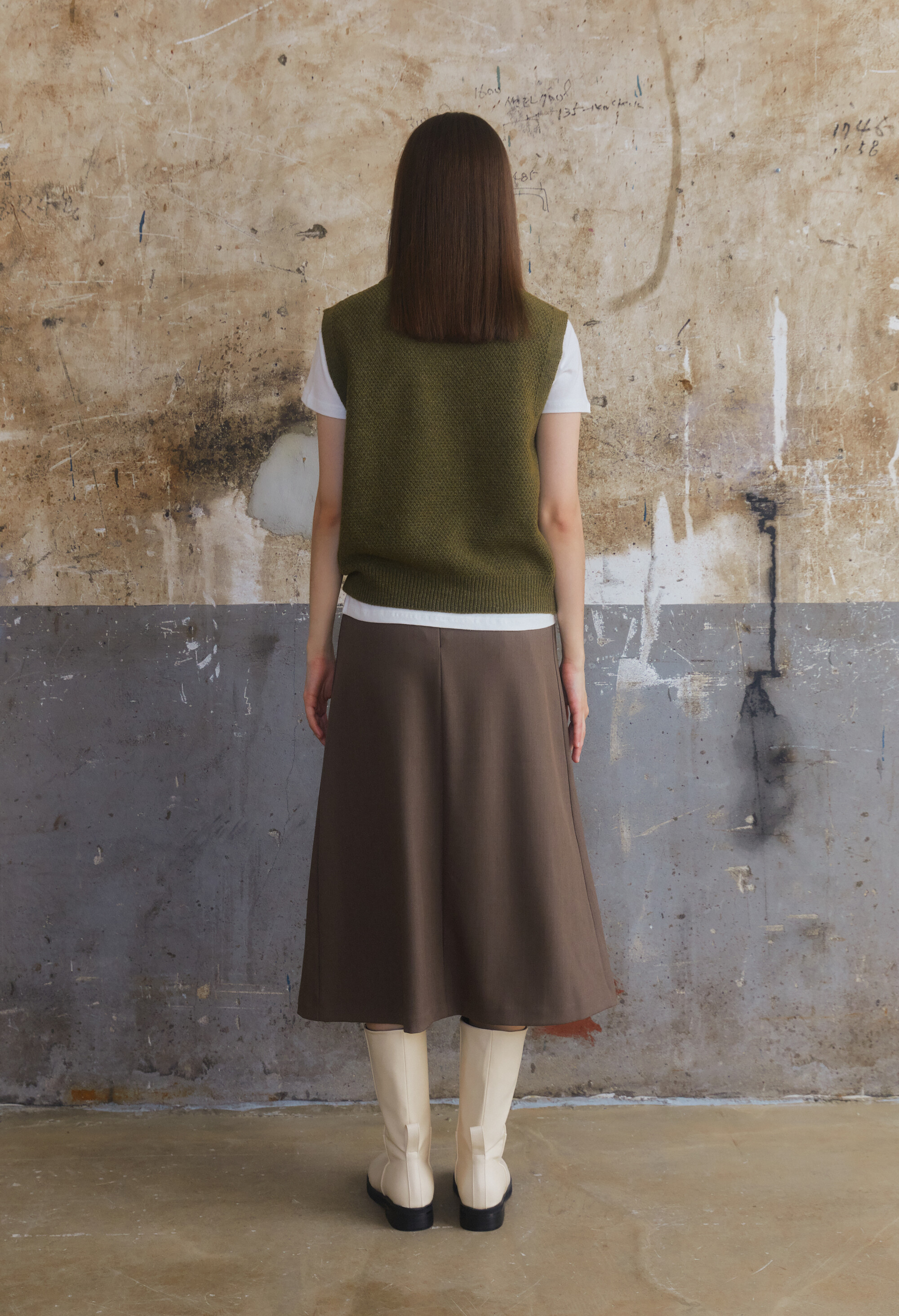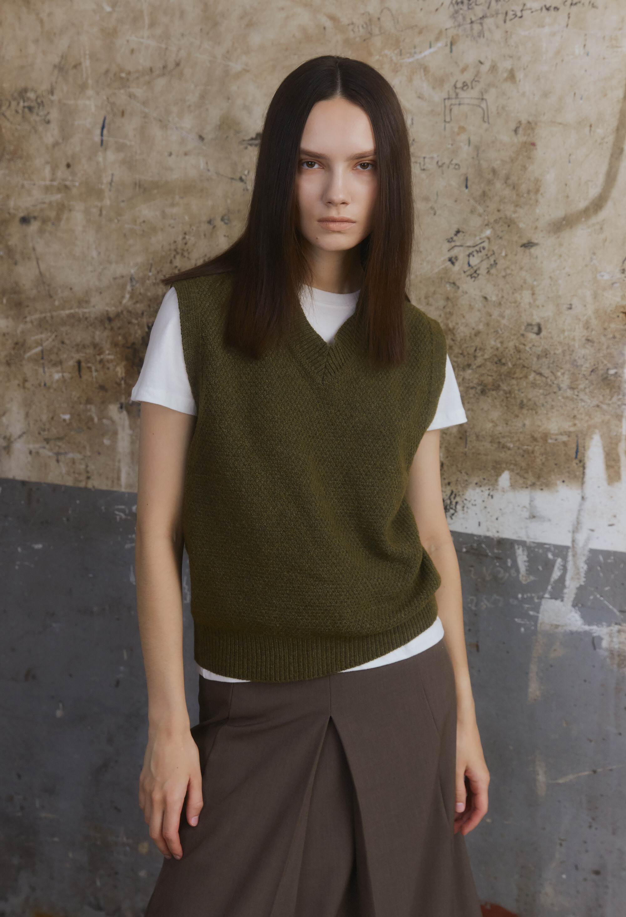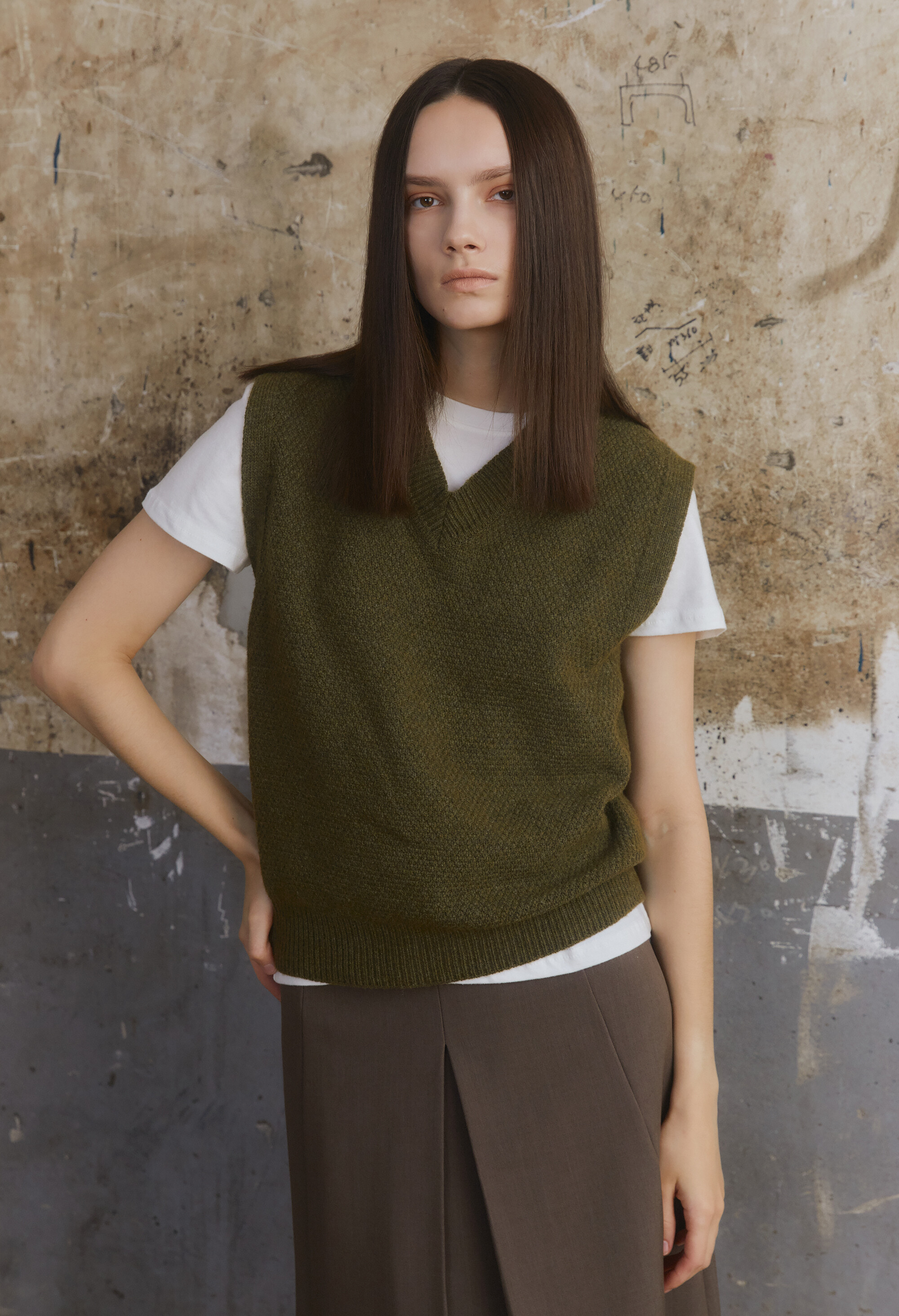 [E504] Wool V-Neck Vest - Khaki